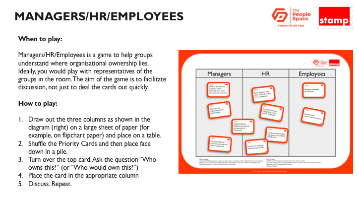 Developed by HR directors, chief executives and HR experts across a spectrum of business sectors, Priorities Cards can be accompanied by coaching and workshop services, delivered by our partner Matt Ballantine from Stamp London, and additional supporting tools focused on particular user groups. There are also themed-based card sets, the first of which focuses on Startup Priorities.